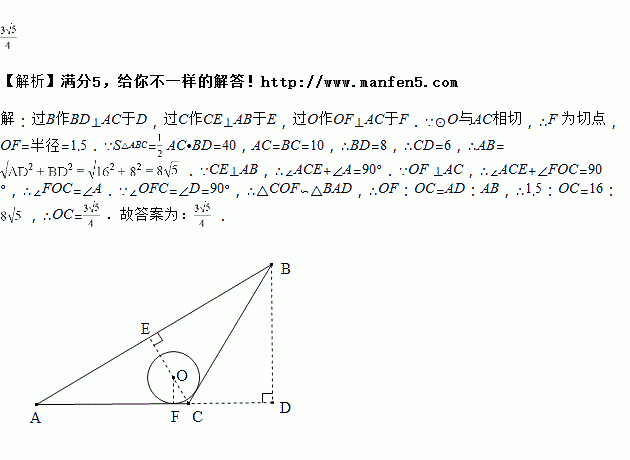 面积为40的△ABC中,AC=BC=10,∠ACB>90°,半径为1.5的⊙O与AC、BC都相切,则OC的长为_________.