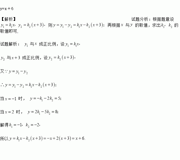 y=x+6 【解析】试题分析:根据题意设 则 再根据与的取值,求出的取值即可. 试题解析: 与成正比例,设 与成正比例,设 又 ∴ 当时, 当时, 解得 所以