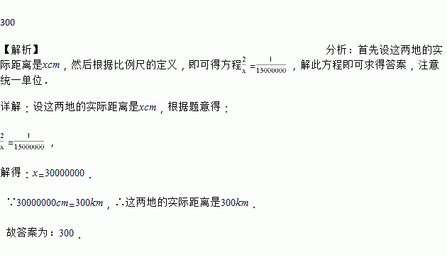 (在比例尺是1:15000000的地图上,测得甲乙两地的距离是2厘米,那么甲乙两地的实际距离是_____千米.