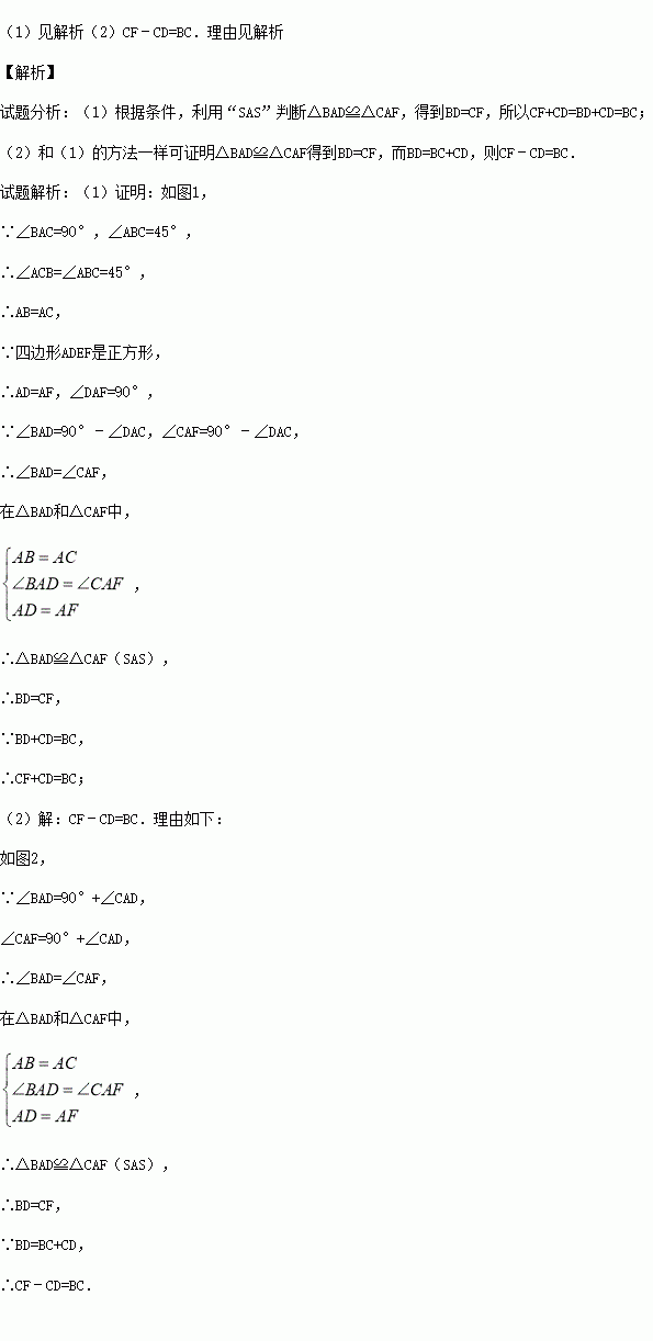 (2)如图2,当点D在线段BC的延长线上时,其他条件不变,则CF,BC,CD三条线段之间有什么关系?并说明理由.