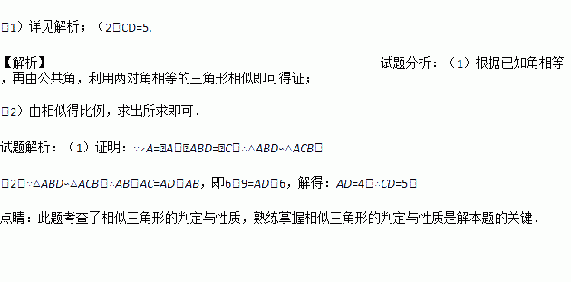 如图,D是△ABC的边AC上的一点,连接BD,已知∠ABD=∠C,AB=6,AC=9.
