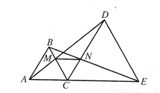 如图,C是线段AE上一点,△ABC、△CDE都是等边三角形,AD与BC交于点M,BE与CD交于点N。