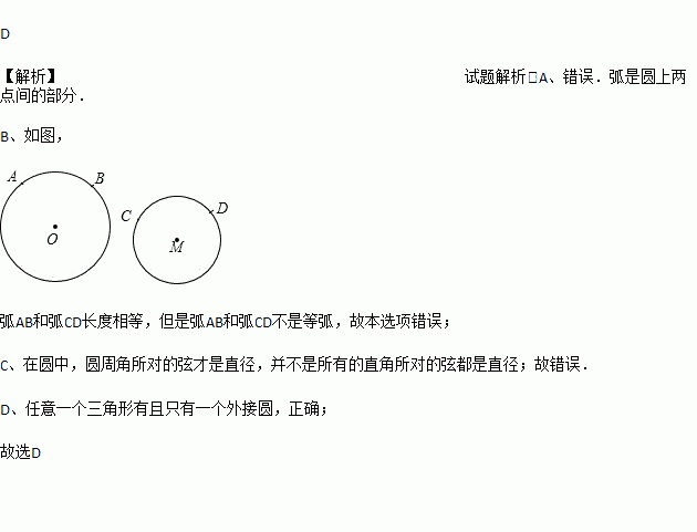 C. 在圆中直角所对的弦是直径 D. 任意一个三角形有且只有一个外接圆