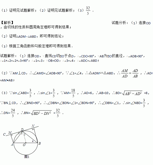(10分)如图,AB为⊙O的直径,直线CD切⊙O于点D,AM⊥CD于点M,BN⊥CD于N.