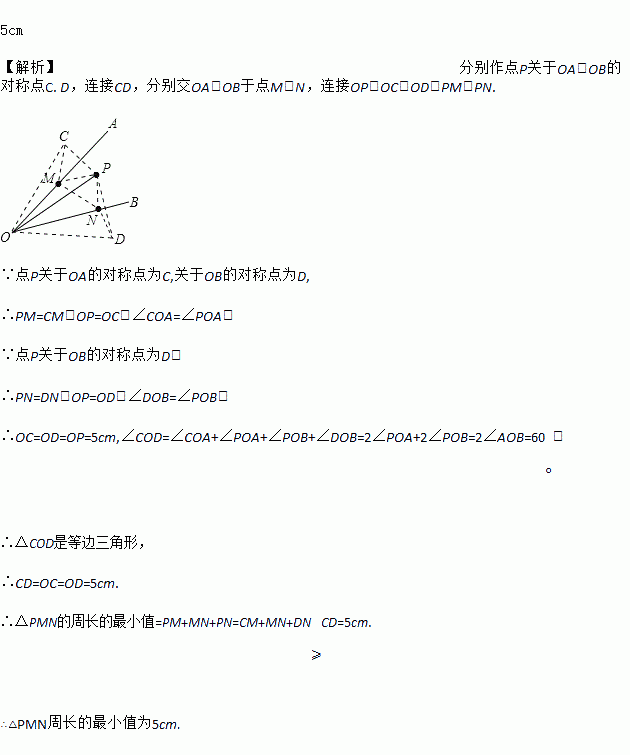 ÈçͼËùʾ£º¡ÏAOBµÄÄÚ²¿ÓÐÒ»µãP£¬µ½¶¥µãOµÄ¾àÀëΪ5cm£¬M¡¢N·Ö±ðÊÇÉäÏßOA¡¢OBÉϵ͝µã£®Èô¡ÏAOB =30