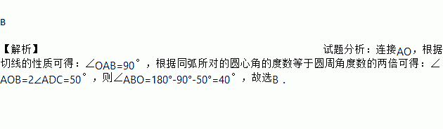 如图,在⊙O中,AD,CD是弦,连接OC并延长,交过点A的切线于点B,若∠ADC=25°,则∠ABO的度数为( )