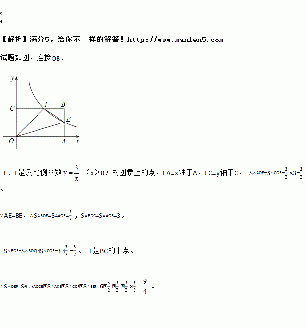 如图,反比例函数(x>0)的图象与矩形OABC的边长AB、BC分别交于点E、F且AE=BE,则△OEF的面积的值为 .