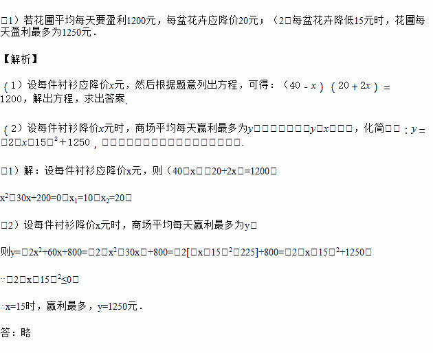(1)若花圃平均每天要盈利1200元,每盆花卉应降价多少元?