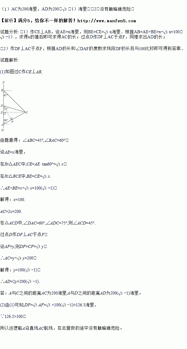 (2)已知距观测点D处100海里范围内有暗礁,若巡逻船A沿直线AC去营救船C,在去营救的途中有无触礁的危险?(参考数据: