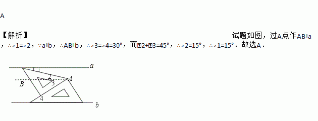 将一副三角板和一张对边平行的纸条按如图摆放,两个三角板的一直角边重合,含30°角的直角三角板的斜边与纸条一边重合,含45°角的三角板的一个顶点在纸条的另一边上,则∠1的度数是( )