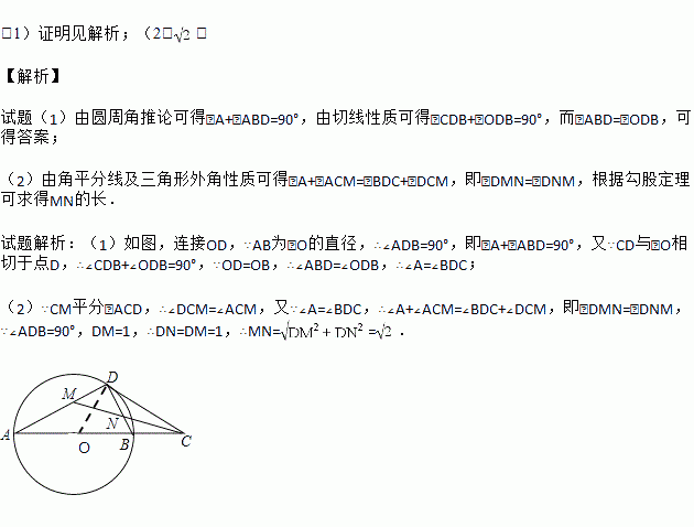 (2)若CM平分∠ACD,且分别交AD、BD于点M、N,当DM=1时,求MN的长.