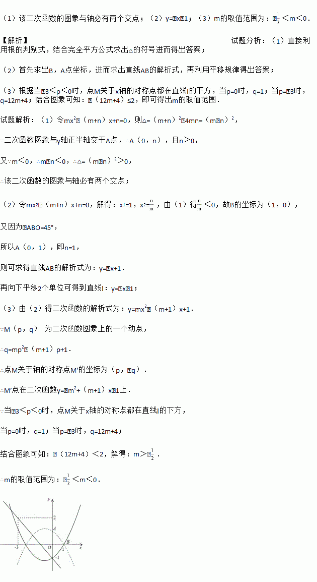 (3)在(2)的条件下,设M(p,q)为二次函数图象上的一个动点,当﹣3<p<0时,点M关于x轴的对称点都在直线l的下方,求m的取值范围.