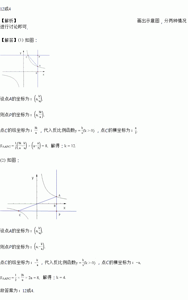 过双曲线的动点作轴于点,是直线上的点,且满足,过点作轴的平行线交此双曲线于点.如果的面积为8,则的值是__________.