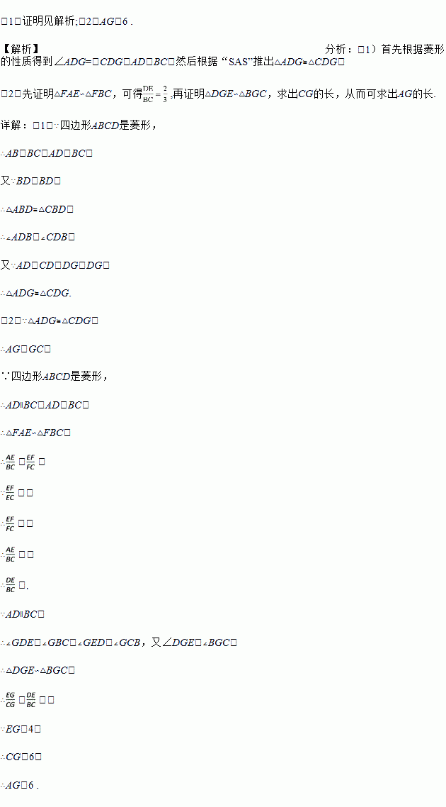 如图,在菱形ABCD中,G是BD上一点,连接CG并延长交BA的延长线于点F,交AD于点E.