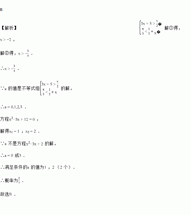 从这七个数中随机抽取一个数记为,则的值是不等式组的解,但不是方程的实数解的概率为( ).