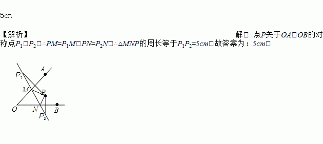 如图,分别作出点P关于OA、OB的对称点P1、P2,连结P1P2,分别交OA、OB于点M、N,若P1P2=5cm,则△PMN的周长为_____.