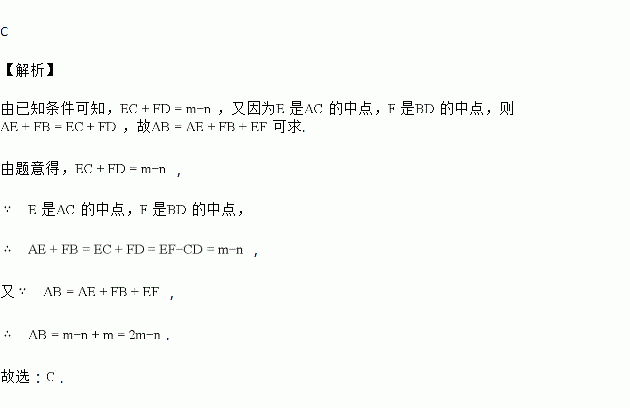 如图,C,D是线段AB上的两点,点E是AC的中点,点F是BD的中点,EF=m,CD=n,则AB的长是( )