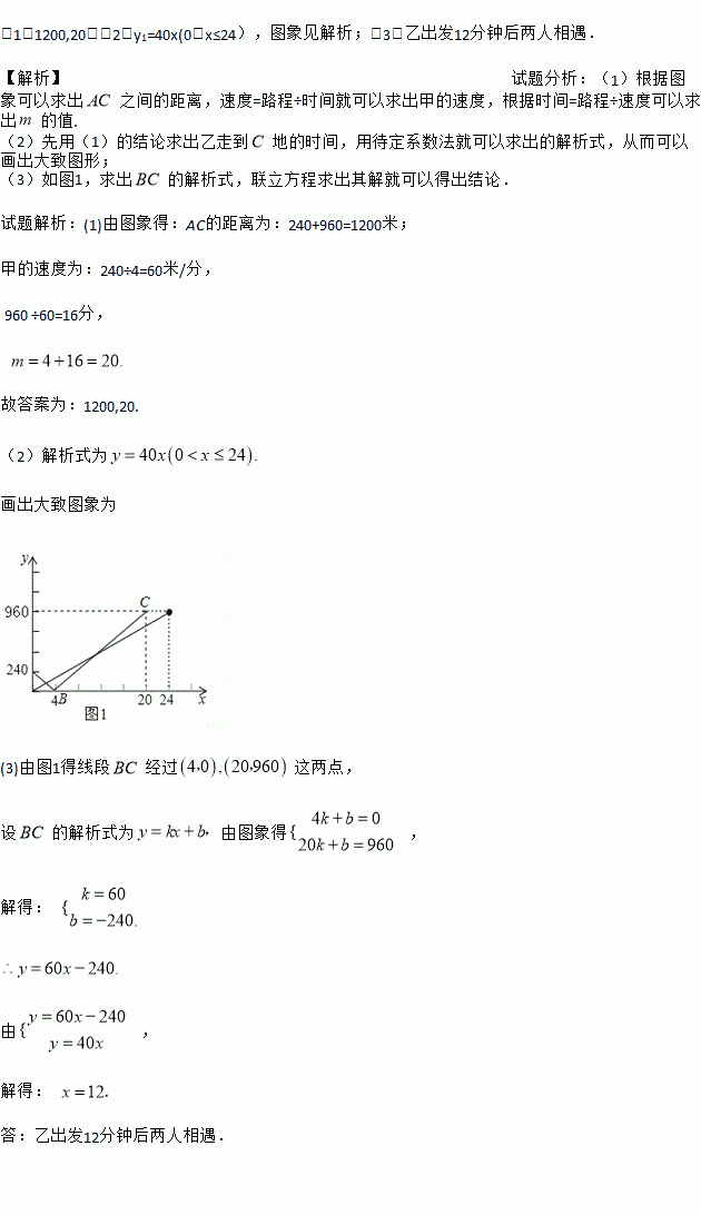 (1)1200,20;(2)y1=40x(0<x≤24),图象见解析;(3)乙出发12分钟后两人相遇. 【解析】试题分析:(1)根据图象可以求出之间的距离,速度=路程÷时间就可以求出甲的速度,根据时间=路程÷速度可以求出的值. (2)先用(1)的结论求出乙走到地的时间,用待定系数法就可以求出的解析式,从而可以画出大致图形; (3)如图1,求出的解析式,联立方程求出其解就可以得出结论. ...