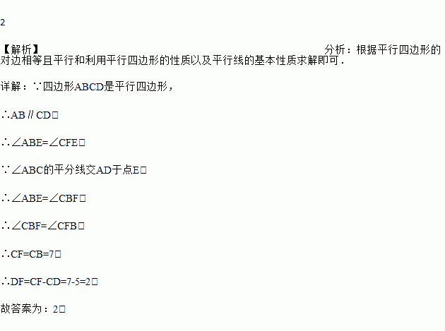 已知,如图,在□ABCD中,AB=5cm,AD=7cm,∠ABC的平分线交AD于点E,交CD的延长线于点F,则DF=_____cm.