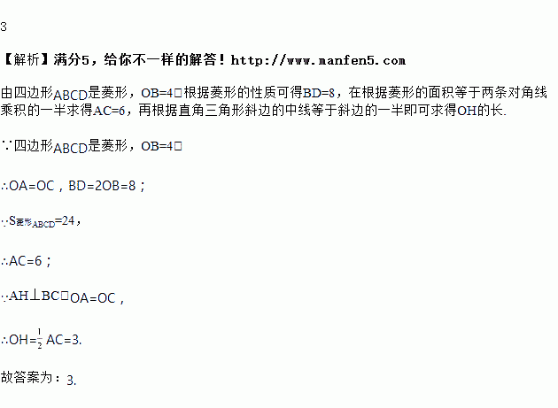 如图,菱形ABCD的对角线AC,BD相交于点O,过点A作AH⊥BC于点H,连接OH.若OB=4,S菱形ABCD=24,则OH的长为______________.