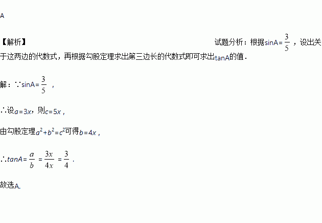 在Rt△ABC中,∠C=90°,sinA=,则tanA等于( )