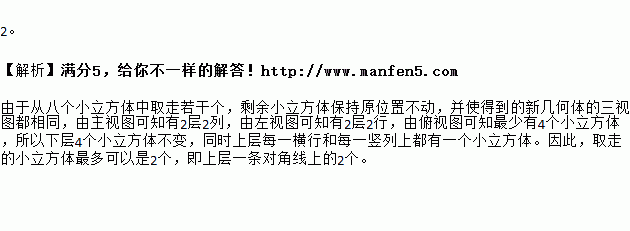 用八个同样大小的小立方体粘成一个大立方体如图1,得到的几何体的三视图如图2所示,若小明从八个小立方体中取走若干个,剩余小立方体保持原位置不动,并使得到的新几何体的三视图仍是图2,则他取走的小立方体最多可以是 ▲ 个.![]()