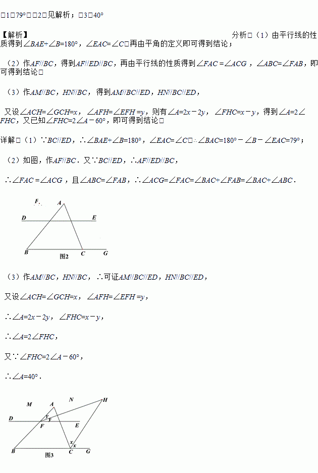 (3)如图3,FH平分∠AFE,CH平分∠ACG,且∠FHC比∠A的2倍少60°,直接写出∠A的度数.