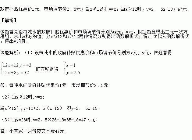 某地为了鼓励居民节约用水,决定实行两级收费制,即每月用水量不超过12吨(含12吨)时,每吨按政府补贴优惠价收费;每月超过12吨,超过部分每吨按市场调节价收费,小黄家1月份用水24吨,交水费42元.2月份用水20吨,交水费32元.