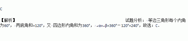如图,一个等边三角形纸片,剪去一个角后得到一个四边形,则图中∠α+∠β的度数是( )
