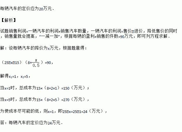 某汽车4S店销售某种型号的汽车,每辆进货价为15万元,该店经过一段时间的市场调研发现:当销售价为25万元时,平均每周能售出8辆,而当销售价每降低0.5万元时,平均每周能多售出1辆.该4S店要想平均每周的销售利润为90万元,并且使成本尽可能的低,则每辆汽车的定价应为多少万元?
