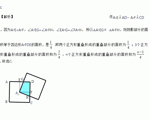如图,将n个边长都为1cm 的正方形按如图所示的方法摆放,点 A1 ,A2,…, An 分别是正方形的中心,则n个这样的正方形重叠部分(阴影部分)的面积和为( )