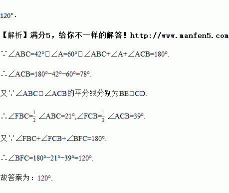 如图,在中,、的平分线BE、CD相交于点F,,,则______.