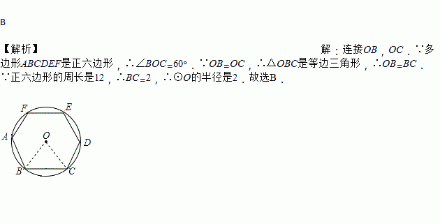 正六边形ABCDEF内接于⊙O,正六边形的周长是12,则⊙O的半径是( )