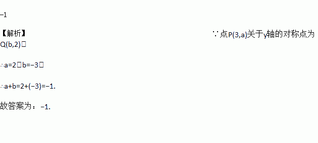已知点P(3,a)关于y轴的对称点为Q(b,2),则a+b=_________ .