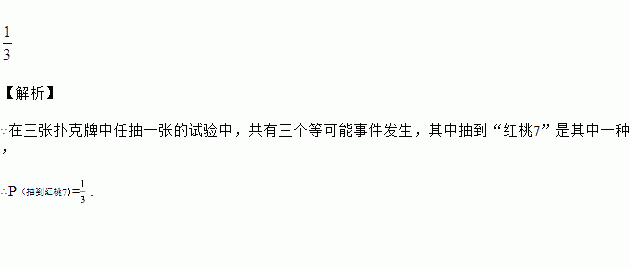 如图,在这三张扑克牌中任意抽取一张,抽到“红桃7”的概率是 .