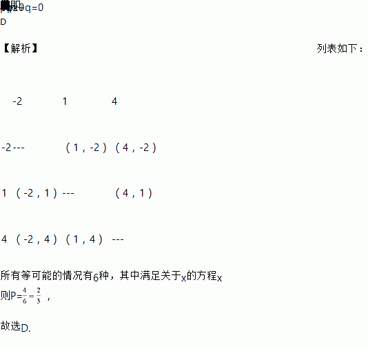 一个盒子里有完全相同的三个小球,球上分别标有数字-2,1,4.随机摸出一个小球(不放回),其数字记为p,随机摸出另一个小球,其数字记为q,则满足关于x的方程x2+px+q=0有实数根的概率是( )