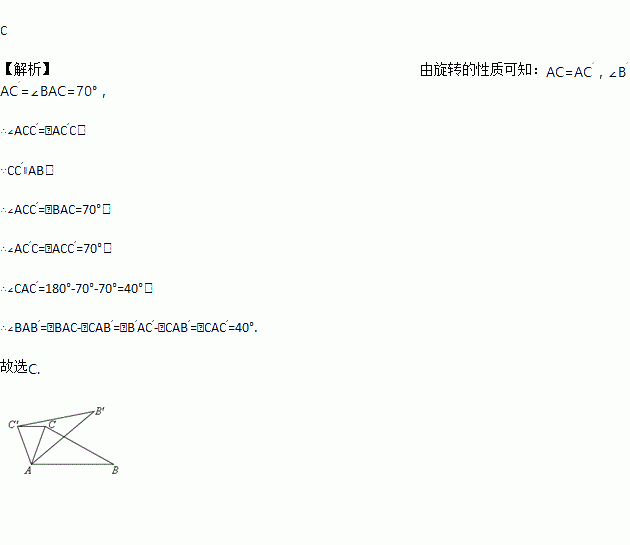 如图,在中,∠CAB=70°,在同一平面内, 将绕点A旋转到的位置,使得CC′∥AB,则=( )