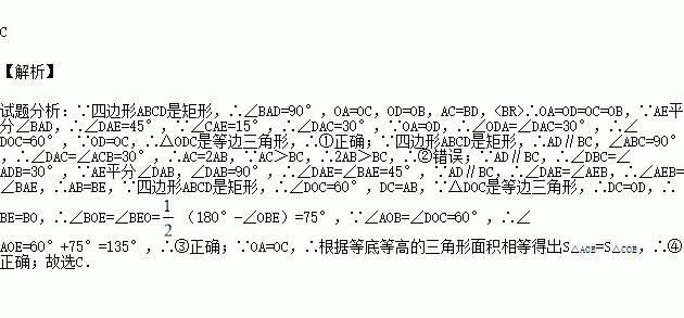 如图,矩形ABCD中,AE平分∠BAD交BC于E,∠CAE=15°,则下列结论:① △ODC是等边三角形;②BC=2AB;③∠AOE=135°; ④S△AOE=S△COE,其中正确的结论的个数有