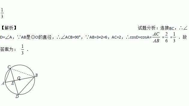 如图,在半径为3的⊙O中,直径AB与弦CD相交于点E,连接AC,BD.若AC=2,则cosD=________.