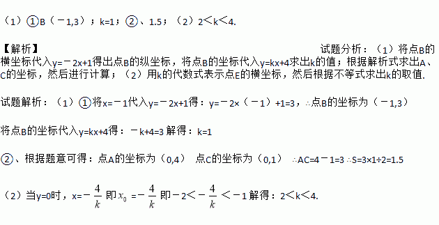 (1)①B(-1,3);k=1;②、1.5;(2)2<k<4. 【解析】试题分析:(1)将点B的横坐标代入y=-2x+1得出点B的纵坐标,将点B的坐标代入y=kx+4求出k的值;根据解析式求出A、C的坐标,然后进行计算;(2)用k的代数式表示点E的横坐标,然后根据不等式求出k的取值. 试题解析:(1)①将x=-1代入y=-2x+1得:y=-2×(-1)+1=3,∴点B的坐标为(-1,3...