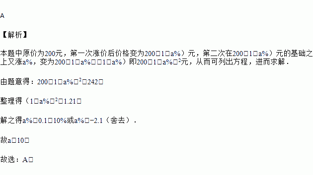 某服装原价为200元,连续两次涨价a%后,售价为242元,则a的值为( )