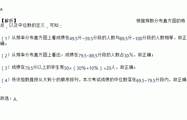 (1)成绩在49.5分~59.5分段的人数与89.5分~100分段的人数相等;