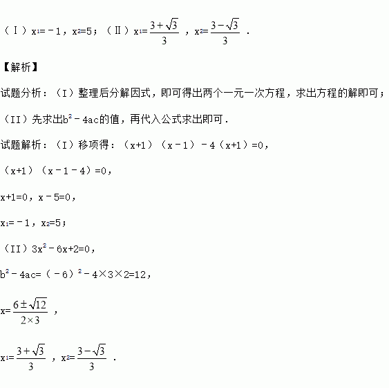 (Ⅰ)x1=﹣1,x2=5;(Ⅱ)x1=,x2=. 【解析】 试题分析:(I)整理后分解因式,即可得出两个一元一次方程,求出方程的解即可; (II)先求出b2﹣4ac的值,再代入公式求出即可. 试题解析:(I)移项得:(x+1)(x﹣1)﹣4(x+1)=0, (x+1)(x﹣1﹣4)=0, x+1=0,x﹣5=0, x1=﹣1,x2=5; (II)3...