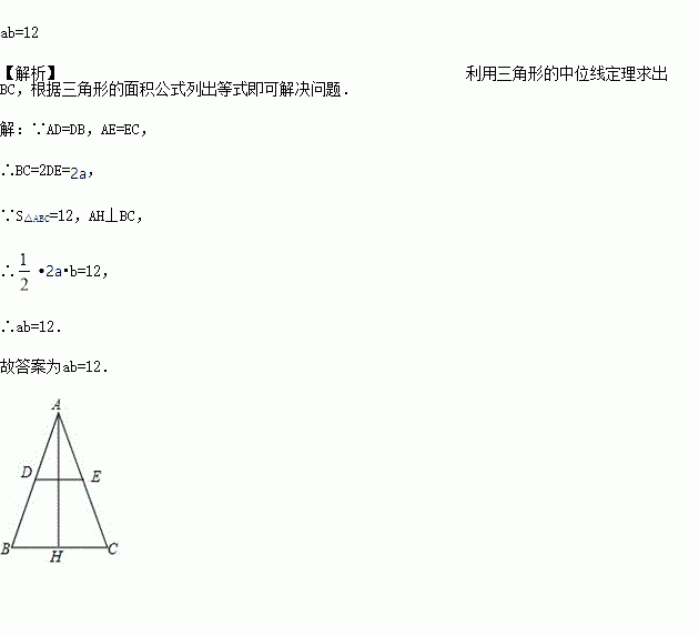 如图,点D、E是AB、AC边的中点,AH是△ABC的高,DE=a,AH=b,△ABC的面积为12,则a与b的函数关系式是:____.