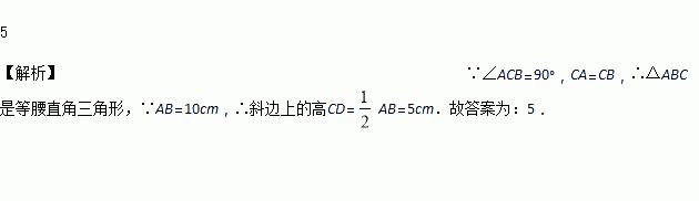 在Rt△ABC中,∠ACB=90°,CA=CB,如果斜边AB=10cm,那么斜边上的高CD=_______cm.