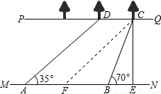 如图,河流的两岸PQ、MN互相平行,河岸PQ上有一排小树,已知相邻两树之间的距离CD=50米,某人在河岸MN的A处测得∠DAN=35°,然后沿河岸走了120米到达B处,测得∠CBN=70°.求河流的宽度CE(结果保留两个有效数字).(参考数据:sin35°≈0.57,cos35°≈0.82,tan35°≈0.70,sin70°≈0.94,cos70°≈0.34,tan70°≈2.75)