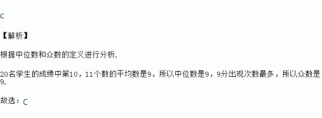 一次信息技术模拟测试后,数学兴趣小组的同学随机统计了九年级20名学生的成绩记录如下:有5人得10分,6人得9分,5人得8分,4人得7分![]()