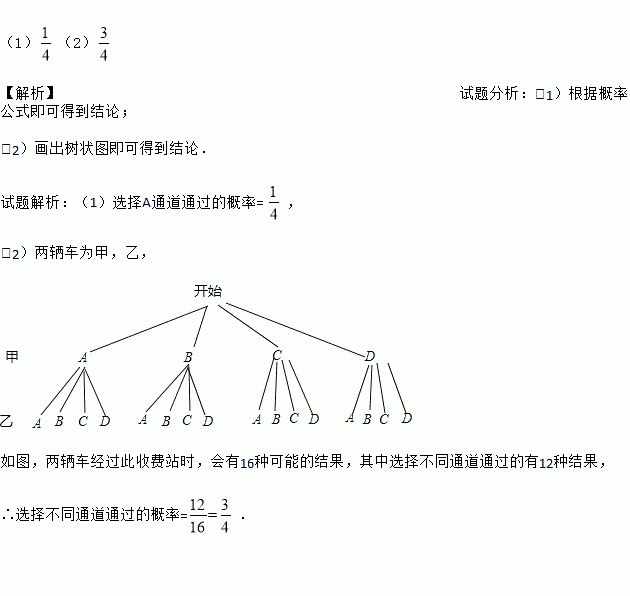 车辆经过某市收费站时,可以在4个收费通道 A、B、C、D中,可随机选择其中的一个通过.