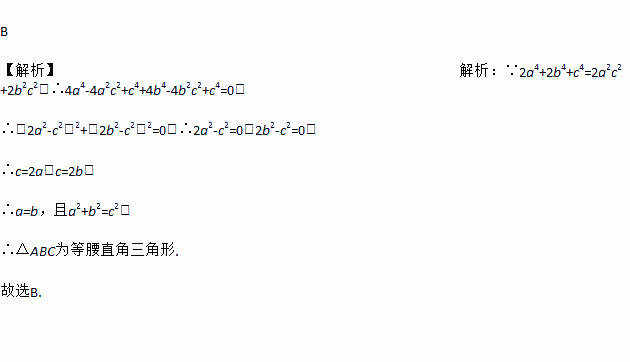 B 【解析】解析:∵2a4+2b4+c4=2a2c2+2b2c2,∴4a4-4a2c2+c4+4b4-4b2c2+c4=0, ∴(2a2-c2)2+(2b2-c2)2=0,∴2a2-c2=0,2b2-c2=0, ∴c=2a,c=2b, ∴a=b,且a2+b2=c2, ∴△ABC为等腰直角三角形. 故选B.