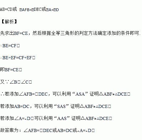 如图,已知B、E、F、C在同一直线上,BE=CF,∠B=∠C,则添加条件∠AFB=∠DEC或AB=DC _______(添加一个条件即可),可以判断△ABF ≌△DCE.
